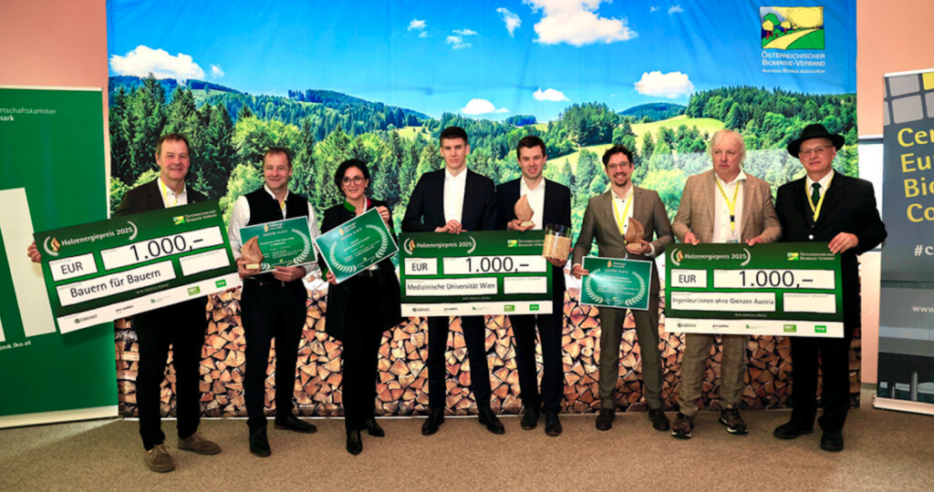 (PA_ÖBMV) – Seit nunmehr drei Jahren wird der Holzenergiepreis für herausragende Leistungen in der Bioenergie-Branche vergeben. Im Rahmen der 8. Mitteleuropäischen Biomassekonferenz in Graz wurden die Sieger in den Kategorien Hackgut, Pellets und Forschung gekürt. Eine Expertenjury unter dem Vorsitz von Dr. Josef Rathbauer, BLT Wieselburg, wählte aus den eingereichten innovativen Umsetzungen die Preisträger aus. Die drei Gewinner sind: Die Energiewerk Ilg GmbH mit der „CO2-Abscheidung im Holzkraftwerk“ in der Kategorie Hackgut; das Projekt Solarpellet der Zellhofer Engineering GmbH im Bereich Pellets; in der Forschung überzeugte das Projekt Waste2Value – Forschungsanlage Wien-Simmering. Die drei Gewinner spenden das Preisgeld an karitative Organisationen. Der Dank gilt den Sponsoren Österreichische Hagelversicherung, Kelag Energie & Wärme, Österreichische Bundesforste, proPellets Austria und der Landwirtschaftskammer Österreich.