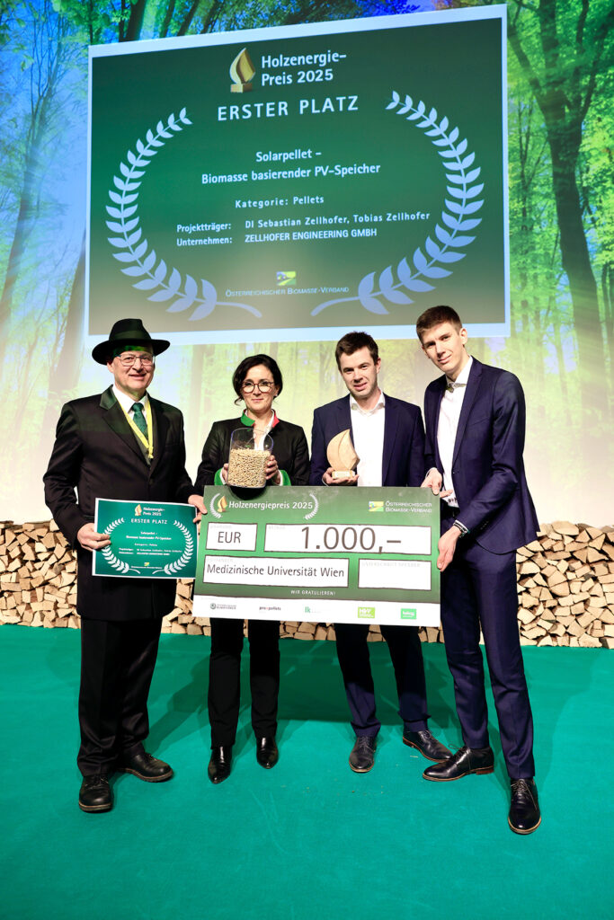 „Das Projekt Solarpellet der Zellhofer Engineering GmbH revolutioniert die Art und Weise, wie erneuerbare Energie und Biomasse miteinander verbunden werden. Es handelt sich um eine mobile, vollautonome Pelletieranlage, die überschüssigen Photovoltaik-Strom direkt vor Ort nutzt, um Hackschnitzel in hochwertige Holzpellets zu verwandeln. Die Besonderheit liegt in der intelligenten, KI-gestützten Steuerung“, schildert Doris Stiksl, Geschäftsführerin von proPellets Austria, bei der Preisübergabe. „Viele Pelletieranlagen verwenden Strom, den sie selbst erzeugen. Neu und innovativ ist der Einsatz von KI. Die KI übernimmt bei Zellhofer die komplette Anlagensteuerung – sie analysiert Wetterdaten, Photovoltaik-Erträge und Betriebsparameter in Echtzeit und entscheidet selbstständig, wann und wie produziert wird. Dadurch wird der Eigenverbrauch von Solarstrom maximiert, die Netzbelastung reduziert und eine nahezu CO2-freie Produktion ermöglicht.“