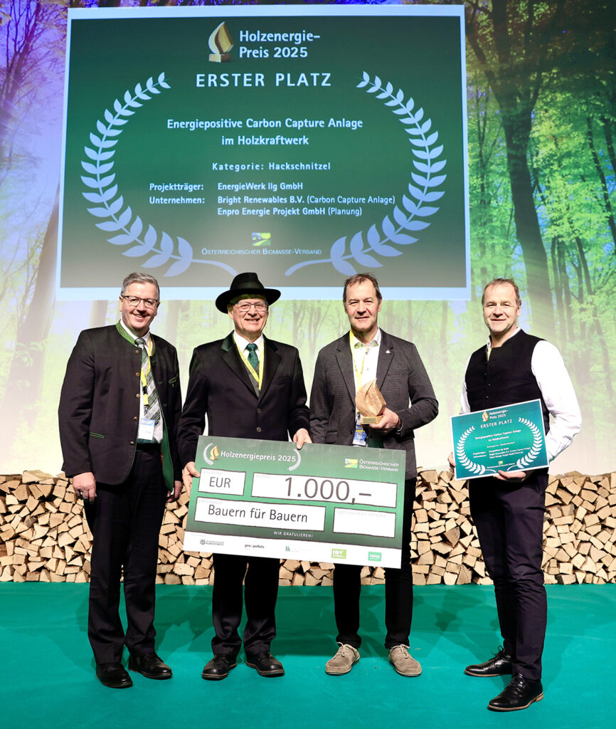 „Seit September 2025 läuft in Dornbirn ein echtes Pionierprojekt: Die erste landesweite Anlage zur CO2-Abscheidung aus einem Biomassekraftwerk ist in Betrieb. Sie fängt Kohlendioxid aus den Abgasen des Holzkraftwerks ein und macht daraus einen wertvollen biogenen Rohstoff für regionale Betriebe. Dafür wird die EnergieWerk Ilg GmbH mit dem Holzenergiepreis 2025 in der Kategorie Hackschnitzel ausgezeichnet“, begründet Andreas Steinegger, Präsident der Landwirtschaftskammer Steiermark, anlässlich der Verleihung. „Das Projekt ist weltweit einmalig und wegweisend. Das Kraftwerk erzeugt aus dem regionalen Energieträger Hackgut gleichzeitig Strom, Wärme, Pflanzenkohle und flüssiges CO2. Dabei verfolgt es einen ganzheitlichen Ansatz, der Nachhaltigkeit, Kreislaufwirtschaft, Dekarbonisierung und Negativemissionen miteinander verbindet.“