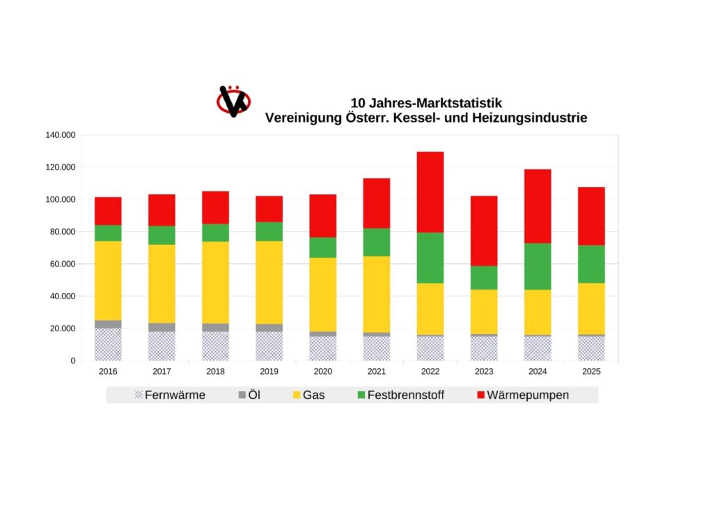 (PA_VÖK) Die politischen Rahmenbedingungen bestimmten die Marktentwicklung des Jahres 2025 maßgeblich. Der Vorrang der Fernwärme führt dazu, dass in Österreich bereits rund ein Drittel der Wohneinheiten, etwa 1,65 Millionen, über Fernwärme versorgt wird und somit keine dezentralen Heizungsanlagen benötigt. Das lange Warten auf die neue Bundesförderung schlug sich ebenfalls in den Zahlen nieder: Insgesamt wurden 92.500 Heizungsanlagen verkauft, was einem Minus von 11 % gegenüber 2024 entspricht, informierten Vertreter der Vereinigung Österreichischer Kessel- und Heizungsindustrie (VÖK) anlässlich einer Pressekonferenz im Rahmen der Energiesparmesse Wels.